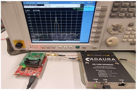 To control the attenuation level, a digital RF attenuator ADAURA was included between the WuTx and the WuRx. This digital attenuator was tested with the continuous wave (CW) mode of the SPIRIT1 transceiver that was attached to a spectrum analyzer, as shown in