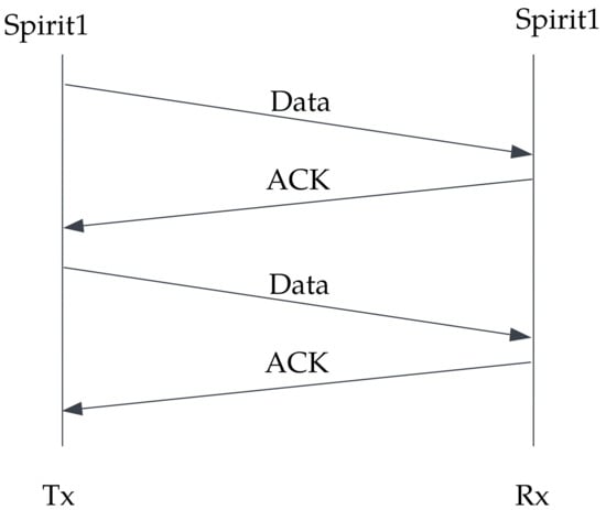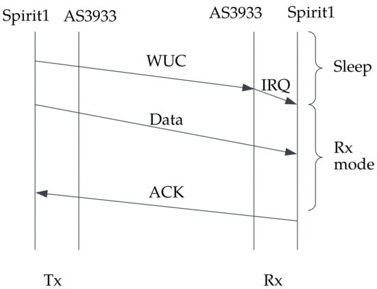 When the AS3933 validated the Wupt passed by the envelope detector, it sent an interrupt to the MSP430G2553 to activate the main transceiver and turn it into Idle reception mode, waiting for the data packet. When the data were received, the SPIRIT1 transceiver sent back an acknowledgment (ACK) to inform the transmitter that the packet had arrived. A sequence diagram shows the communication protocol process in