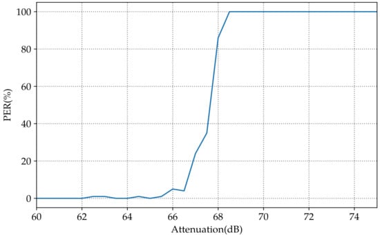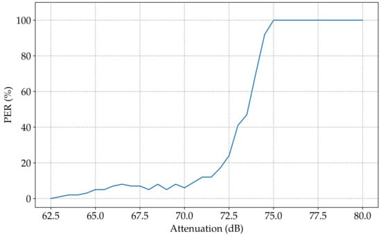 When the attenuation rose from to , the PER changed from 6% to 100%. This showed the limit of the sensitivity of the SPIRIT1 transceiver; at this point, the transmission power was preserved, and the level of attenuation was . The SPIRIT1 transceiver was attached to the spectrum analyzer to obtain the received output power, which was .