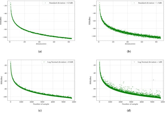 36], an experiment to measure the RSSI using a CC2420 2.4 GHz radio chip was was conducted in outdoor and indoor environments within the line of sight. The experiment curve showed that the deviation in the RSSI value was different from one environment to another. In indoor environments, the noise is higher due to the presence of obstacles with a higher probability of the reflection of the waves.