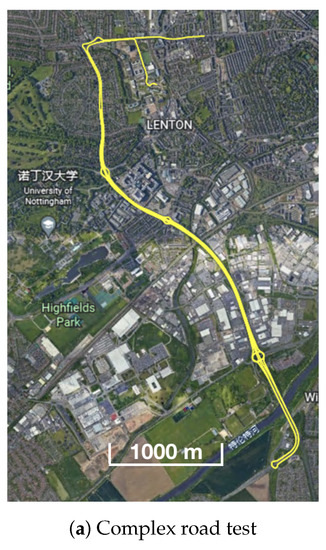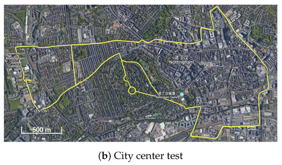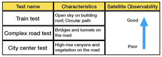 The train operated on the roof of the Nottingham Geospatial Building (NGB), along a circular path and had good satellite visibility. The van tests were designed on a complex road at the city center, where frequent signal blockage occurred due to bridges, high-rises, and vegetation. Figure 3 shows the van motion trajectories, and Figure 4 summarises the experimental characteristics according to the difficulty level of the GNSS signal reception.