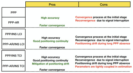 As PPP with (AR) has been increasingly studied, PPP/INS integration with AR has also been demonstrated. In [32,33], the GPS PPP/INS TCI with AR was studied. The between-satellite single-difference PPP model is used and the CNES WSB and ’integer’ phase clock products were applied for phase-bias correction. In [34], they studied the ambiguity-fixed GPS PPP/INS TCI. The UPD products were used for AR, and their model was also single-differenced and ionosphere-free. Recently, undifferenced and uncombined PPP models using external precise atmospheric information for integrated navigation were also demonstrated [35,36,37,38], which was also referred as PPP-RTK.