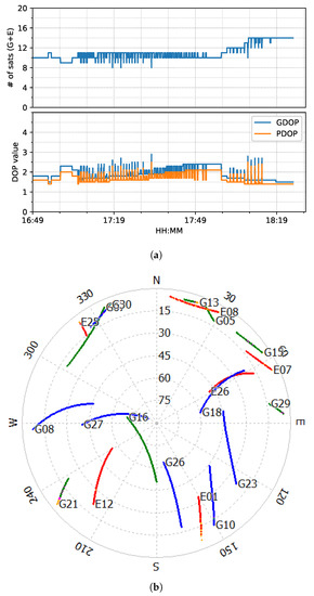 GPS/Galileo satellite information (elevation angle above 10 degrees) of train test on 7 March 2022. (a) Number of satellites and DOP values. (b) Skyplot. (Different color stands for the availability of different frequencies, generated by RTKLIB [50]).