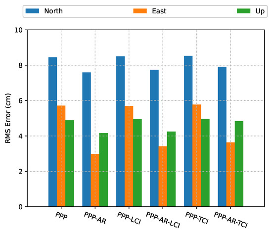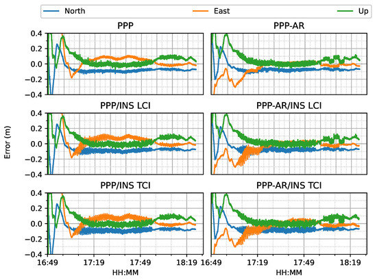 The positioning error RMS of each mode is given in Figure 9. All the real-time PPP/INS solutions obtained an accuracy below 10 cm in each direction. After AR, all the solutions achieved significant improvements on the east component, which were around 47%, 40%, and 38% for PPP-AR, PPP-AR/INS LCI, and PPP-AR/INS TCI, respectively, as compared to the related ambiguity-float solutions. It should be noted that GNSS data had a lower sampling rate than the IMU, and the integrated solutions were entirely determined by INS before the GNSS and INS time were aligned. Therefore, the PPP-solutions had a smaller data size though PPP-AR slightly outperformed LCI and TCI.