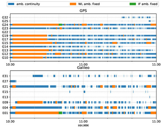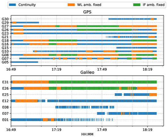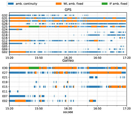 For both ambiguity-float (left column) and ambiguity-fixed (right column) solutions, the integrated results conformed well to the PPP-only solutions. The converged PPP results maintained high positioning accuracy within 10 cm during the test period, mainly because of the optimal observational conditions.With the phase ambiguity resolution (AR), the east component of the three fixed solutions achieved a noticeable improvement, as compared to the related ambiguity-float solutions. However all the solutions still require approximate 25 min to obtain converged solutions. Figure 8 shows the status of the fixed ambiguity for each observed satellite during the train test. More GPS satellites had fixed ionosphere-free (IF) or narrowlane (NL) ambiguities while only two Galileo satellites had fixed IF ambiguities.