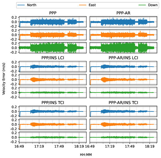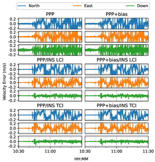 Figure 10 shows the estimated velocity errors. The velocities from the Doppler estimation were much more noisy than that of the integrated solution, especially on the up component. The integrated velocity results had higher accuracy with nearly all components below 5 cm/s, as shown in Figure 11.