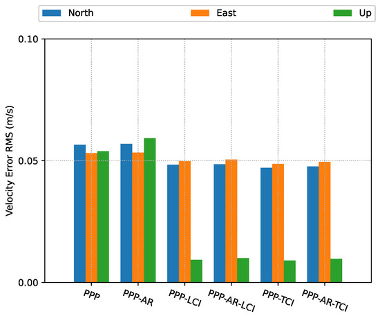 Velocity error RMS of real-time GPS/Galileo PPP/INS positioning of city center test on 27 January 2022 with respect to IE RTK/INS TCI solutions.