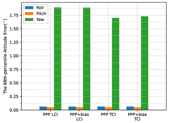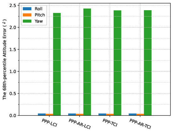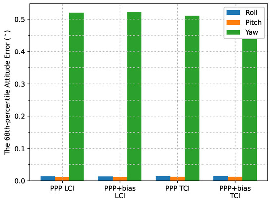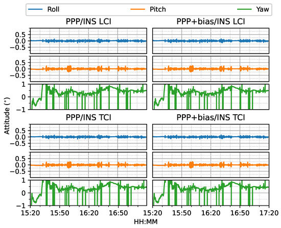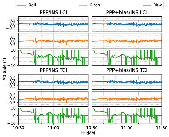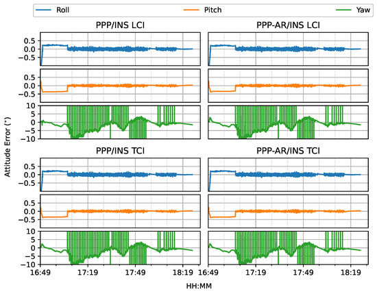 The attitude heading errors also show several spikes in Figure 33, which is similar to Figure 12 and Figure 24. The LCI and TCI attitude solutions are almost identical from Figure 34.