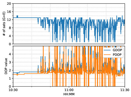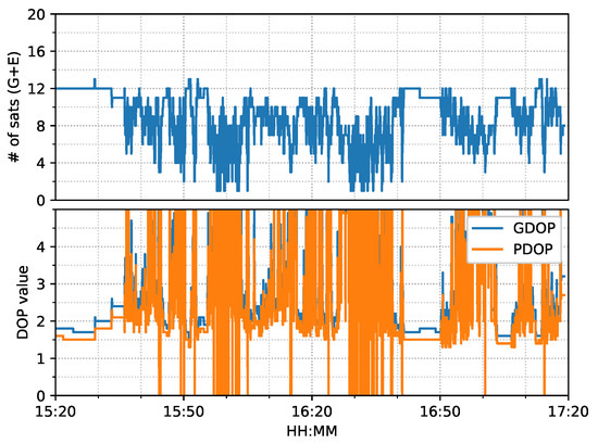 The train test had good satellite observability and low DOP (dilution of precision) values, as shown in Figure 6. It started moving forward at around 17:05 and stopped at around 17:55 for about five minutes. Then, it reversed until 18:15, followed by 10-minute static periods until the end. The positioning results of the six positioning modes are shown in Figure 7.