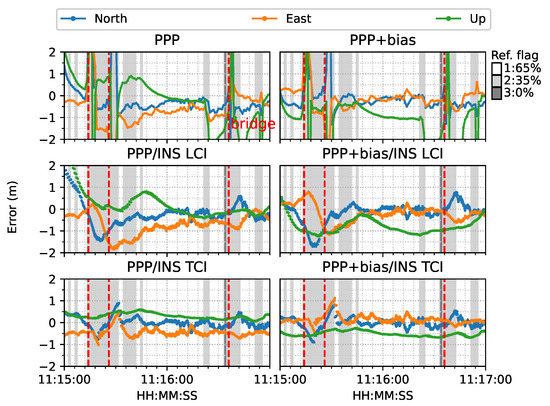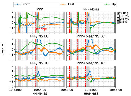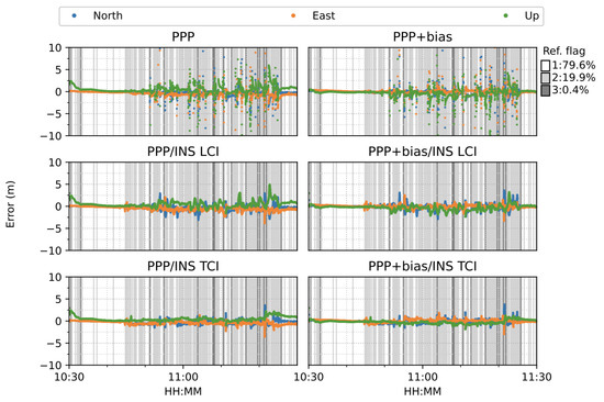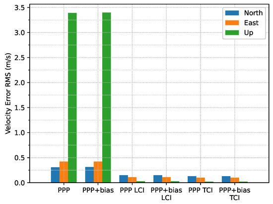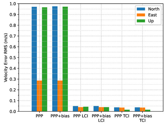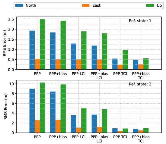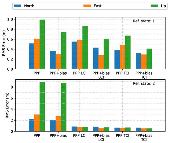 In terms of overall error RMS, as shown in Figure 30, the contribution of the bias correction was mainly for the up component, and the horizontal accuracy was almost equivalent to the solutions without biases for PPP, LCI, and TCI. With respect to the reference state or quality 1 solutions, TCI after bias correction achieved the best performance with an accuracy of 47, 26, and 55 cm in the N/E/U directions, respectively.