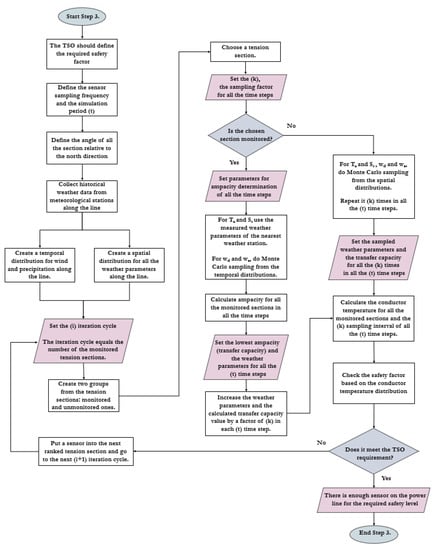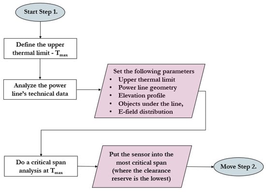 - Step (1)—general power line analysis, including the first sensor’s position (line-monitoring sensor and weather station);