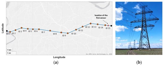 The case study of a 220 kV power line: (a) tension sections of the line with IDs; (b) image of the tension section with ID 15.