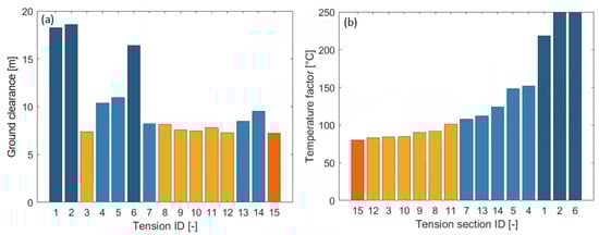 Power line section details: (a) ground clearance result of the critical span analysis; (b) ranking of the tension section based on the temperature factor [16].