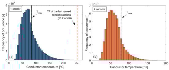 It can be seen from Figure 7a that the conductor temperature several times exceeded 80 °C (Tmax), 95 °C (the annealing limit temperature), and 83 °C, which was the second-ranked tension-section temperature factor. Thus, using one sensor was not enough; additional devices were needed. Figure 7b shows how the conductor temperature distribution developed in the second iteration cycle when two sensors were used. By analogy, the simulations were continued until the desired safety factor.