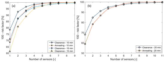The safety factors for clearance and annealing as a function of the sensor number: (a) for the sampling frequency of 10 and 15 minutes; (b) for the sampling frequency of 20 min [16].