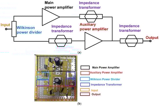 (a) Configuration and (b) implemented PCB of the developed Doherty power amplifier.
