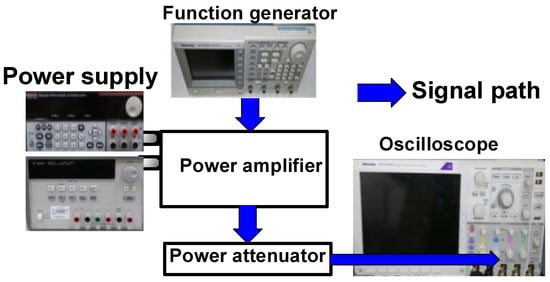 Two power supplies (E3631A and 2231A-3-30, Keysight Technology, Santa Rosa, CA, USA) provided DC to the power amplifiers. For obtaining the output power and PAE, the five-cycle pulses generated from function generator (AFG3252C, Tektronix Inc., Beaverton, OR, USA) were utilized for the ultrasound applications because multi-cycle pulses were applied to operate the ultrasound transducers [65]. These pulses were amplified using power amplifiers, and their amplified pulses were displayed on the oscilloscope through a power attenuator. Figure 5 shows the experimental setup to measure the output power and PAE.