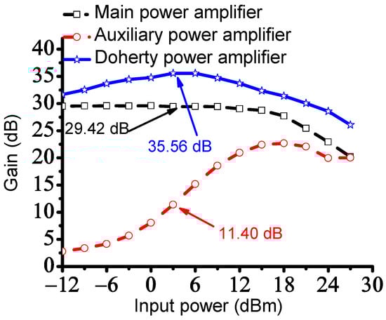 Figure 6 shows the measured gain of the main, auxiliary, and Doherty power amplifiers. The gain of the Doherty power amplifier was improved with the help of the main and auxiliary power amplifiers. The input power was calculated by multiplying the measured voltage and current signals. The operating gate voltage of the auxiliary power amplifier is lower than that of the main power amplifier. Therefore, the gain of the auxiliary power amplifier (2.78 dB) was lower than that of the main power amplifier (29.51 dB) at input power of −12 dBm, as shown in Table 1. As described in Equation (4), the impedance of the auxiliary power amplifier is closed to R0 as the input current (IAUX) increases. Therefore, the auxiliary power amplifier properly works such that the gain of the Doherty power amplifier was saturated at a certain input power level. The gain of the main, auxiliary, and Doherty power amplifiers were measured as 29.42, 11.40, and 35.56 dB at 3.0 dBm, respectively, and the gain of the main, auxiliary, and Doherty power amplifiers were measured as 29.04, 20.95, and 33.71 dB at 12 dBm, respectively.