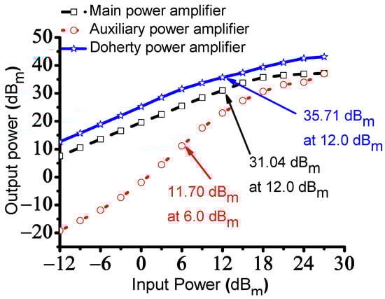 Figure 7 shows the measured output power versus input power with OP1dB of the main, auxiliary, and Doherty power amplifiers. The OP1dB of the main, auxiliary, and Doherty power amplifiers were measured as 31.04 dBm at 12.0 dBm, 11.70 dBm at 6.0 dBm, and 35.71 dBm at 12.0 dBm input powers, respectively, as shown in Figure 8. As mentioned before, the gate voltage of the auxiliary power amplifier is lower than that of the main power amplifier so the output power of the auxiliary power amplifier (−19.22 dBm) was lower than that of the main power amplifier (7.51 dBm) at an input power of −12 dBm as shown in Table 2. However, the impedances of the main and auxiliary power amplifiers were reached to R0 so that the output power of both power amplifiers would be increased accordingly. In the figure, the measured OP1dB (35.71 dBm) of the Doherty power amplifier was improved compared to those (11.70 dBm at 31.04 dBm) of the main and auxiliary power amplifier accordingly.