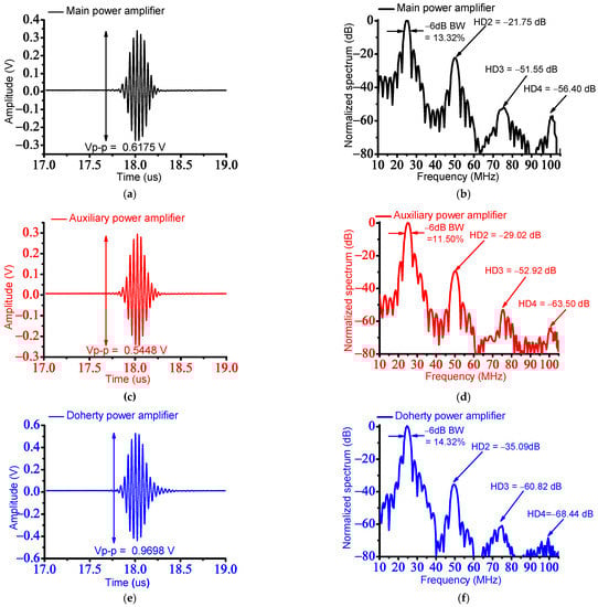 Figure 10 shows the data of the amplitudes and spectra when using a 25 MHz ultrasound transducer with a power amplifier. The outputs of the main and auxiliary power amplifiers would be properly increased, so the Doherty power amplifier would be effectively improved; therefore, the measured echo signal amplitudes of the main, auxiliary, and Doherty power amplifiers were shown. With the trial and error method, the high PAE and relatively adequate harmonic distortion performances of the designed Doherty power amplifier were obtained because those performance parameters of the Doherty power amplifier have a trade-off relationship.