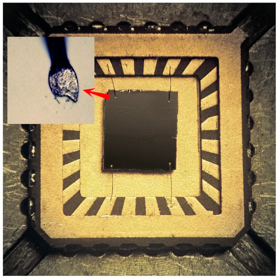 Image of 5 × 5 mm sample mounted in the sample holder. Al/Si wires are attached by bonding.