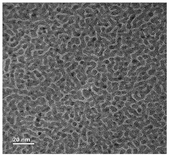 A TEM micrograph of the 5 nm thick Pd film is shown in Figure 2. Polycrystalline fcc Pd (dark in the figure) with crystalline dimensions of 3–5 nm forms a typical percolation pattern. Films thicker than 15 nm are uniform. Figure 3 presents the resistivity of Pd films as a function of thickness. Two ranges can be identified. The resistivity of films with ≥ 10 nm increases gradually with thickness reduction due to an enhanced surface scattering and can be well-fitted by the regular Fuchs–Sondheimer model [29,30]. A sharp resistivity growth starts below 6 nm. The main frame is a semi-logarithmic plot of resistivity as a function of thickness for samples below 6 nm thick. Open and solid circles present the resistivity prior to and after hydrogen loading, respectively. The solid lines are fits to Equation (2): for the hydrogen-free and hydrogenated states, respectively. The fits are good, which confirms that films have fractal topology, and their resistivity is well described by the percolation model. The power index and the critical thickness is nm in both states, indicating that the surface coverage does not change during hydrogenation.