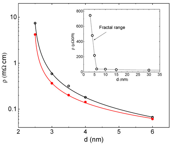 The classical model assumes the resistivity of a uniform media at the onset of the fractal range to be that of the bulk . However, it can be larger than the bulk value due to the surface and grain boundary scattering in thin films [29,30]. The value of the extra-scattering at the fractal range onset can also differ from the bulk. Therefore, we replace the bulk parameters and by their respective values and at the onset of the fractal range. The thickness-dependent extra-scattering resistivity component is then