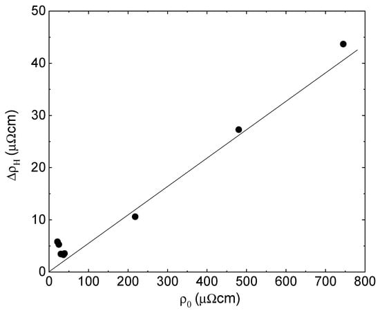 Absorption of hydrogen is expected to add the H scattering and enhance the material resistivity. However, as seen in Figure 3, the final resistivity of the hydrogenated samples is lower than the hydrogen-free ones. Two mechanisms have been suggested to explain the reduction in the resistivity instead of the anticipated enhancement: closure of intergranular gaps due to lateral expansion of inflating Pd clusters [33,34,35] and, alternatively, the out-of-plane thickness expansion [36]. The latter argued that thin films grown on rigid substrates cannot expand laterally within the film plane due to adhesion to the surface. Suppression of the in-plane expansion is equivalent to the application of the in-plane compressive stress leading to the out-of-plane thickness expansion and reduction in resistivity. The thickness of the hydrogenated film increases from before the hydrogenation to after the hydrogenation, where is the thickness expansion coefficient, which depends on the elastic parameters of the given material and the absorbed hydrogen concentration. The overall change in resistivity on hydrogen loading is given by