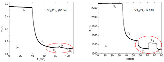Resistance response of 60 nm (a) and 3 nm (b) thick Co26Pd74 films to the sequences of hydrogenation and dehydrogenation cycles. The H scattering terms are marked by ellipses. The background resistance decrease is due to a gradual thickness expansion in the hydrogen atmosphere.