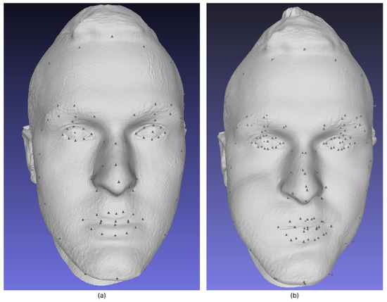 The ICP method is commonly used for matching 2D and 3D laser scans, a challenge known as “scan matching”. It has been used in robotics to match scans from 2D laser range scanners [26]. The motion of the robot is proportional to a function that minimizes the difference between two successive snapshots of the environment. Theoretically, it is possible to create a 2D map of the environment by stitching together a series of snapshots. This method can also be used to create 3D maps, but with the disadvantage that errors accumulate between each snapshot. We did not use the ICP algorithm for mapping, but for alignment. We focused on the ICP algorithm to match two repeated head scans of the same object without any changes to it. Although our point clouds consisted of a considerable number of points, it might be useful to use only a few selected points to compute the optimal transformation between two point clouds. It turns out that depending on the data source, some points are more suitable than others because it is easier to find matches for them. For example, if we look at a frontal view of a 3D scanned head model and select known facial landmarks of the face (such as eyes, lips, etc.), it is easy to overlap scanned models. An example of a 3D face mesh with specified landmarks can be found in Figure 1. The left (a) image represents the face before the medical intervention, and (b) image shows an example face after medical intervention (example to study differences, no real interventions were made on this individual). This example has good descriptive features from which it is easy to select individual overlapping points, such as points around the eyes. We chose area and points around the eyes and in the middle of the forehead, because these points remain almost unchanged from childhood to adulthood [11,27]. After selecting important overlapping landmarks, the alignment process becomes simple while reducing the fitting errors for the selected landmarks. Other unselected locations (points) do not contribute to the function that minimizes the difference. For more information on the code workflow, see the Figure A1 in Appendix A.