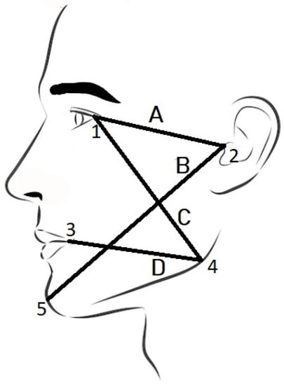 The physical measurement of facial changes consists of measuring facial demarcation lines. The demarcation lines are defined by the five critical spots named; latheral cantuhus of the eye, tragus, pogonion, gonion, labial commisure. Figure 2 illustrates the lines formed from all these five points.