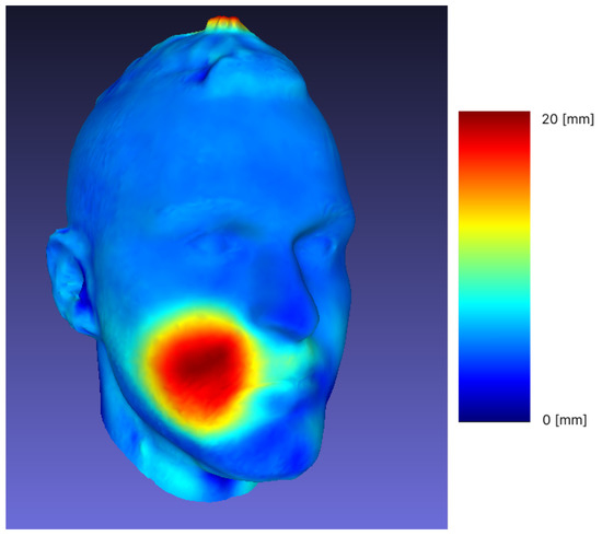 Before overlapping and visualizing different head scans, we used an overlap of the repeated same head scan to determine the reproducibility and influence of the scanner. The matching of 39 different pairs of repeated head scans shows results for the Hausdorff distance (min-max) between pairs in the interval [0–46.71] [mm]. The obtained differences show changes in repeated scans in the interval [0.2446, 3.3863][%]. Individuals with longer hair and accentuated hairstyles had the greatest influence on the difference. When we consider the set without such edge samples, we obtain an overlap difference of less than 1% (mean difference of <2 mm), from which we conclude that this is sufficient for further observation of the differences