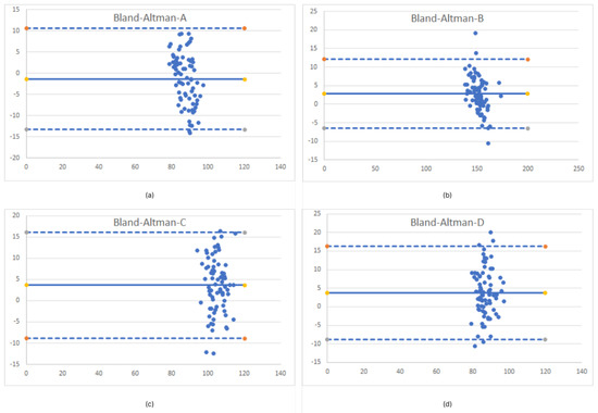 Bland−Altman plots for each demarcation line measurements (a)—Limits of agreement for A line (b)—Limits of agreement for B line (c)—Limits of agreement for C line (d)—Limits of agreement for D line.
