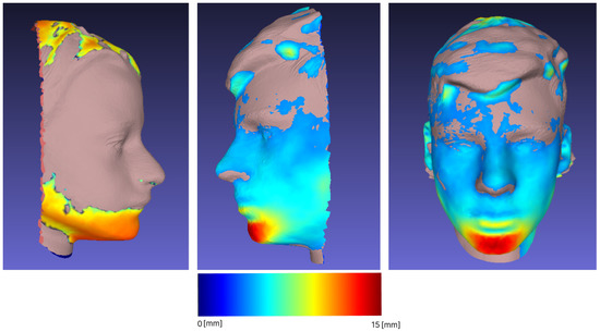 In the third part of our study, we examined the procedure of the Frankel manoeuvre (FM). The procedure of the projection of dental class I occlusion in the dental class II patients is called the Fränkel Manoeuvre (FM), and is often used in clinical decision making [39]. If a soft tissue profile becomes more straight (from convex to less convex or straight, but not towards concave), it is advisable to try to gain, as much as possible, forward growth of the mandible with functional orthodontic appliances during the peak pubertal growth [40]. Recording the initial state and comparing it to the projected goal (scanned FM) will enable better evaluation of the end result (after the treatment), also in comparison with the desired outcome (the FM). It is easier to monitor the change with a series of non-invasive 3D facial scans, as opposed to X-ray imaging [4]. The overlap and matching (shown in Figure 6) of different scans of the same individual subjected to FM show a significant change in the forward movement of the mandible, allowing further comparison and tracking of treatment progress, which would not be possible if we were limited to visualization with X-rays. At each follow-up of different dental procedures and for monitoring the changes, the 3D facial scans could be used and measurements could be taken with a minimum of additional time and discomfort for the patients, as the physical contact of the measuring tape with sensitive, prone to reflex contractions and potentially painful parts of the facial soft tissue is reduced.