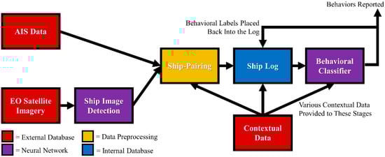 The overall objective for the BATMAN framework is to intake multiple modalities of geospatial intelligence data and identify ships within them. Then, those identified ships will be integrated with additional contextual data to classify their behavior as previously described in Figure 1. Prior to the image and AIS data being fused in the ship-pairing process, the AIS data undergoes some preprocessing techniques to extract more pertinent information from its contents. Additionally, the image data is passed through an object detection neural network to physically identify ships within the imagery. This fused data is then passed to the Ship Log where the identified ships and their associated time stamps are stored. These ships are then routed to the behavioral classifier to determine what they are precisely doing at each point in time. That information is then rerouted back into the Ship Log so it can be used in later classifications.