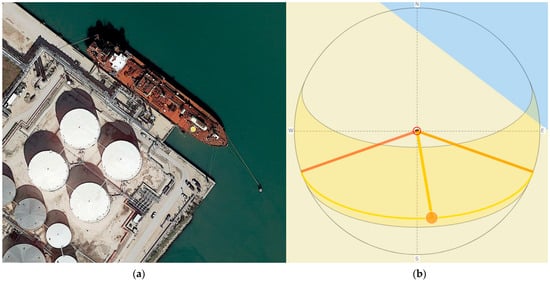 A demonstration of the “sundial” calculation in the Google Earth EO dataset, demonstrating the time of day at which the image was captured: (a) a sample image from the Google Earth EO dataset, with visible shadows cast by the ship and circular structures; (b) the position of the sun as viewed using the SunCalc.org tool on the corresponding date and location of the image, which is provided by Google Earth. The position of the sun is chosen to correspond to the position of the shadows in the image. For this example, the image was captured near Corpus Christi, TX on 31 January 2020. Using the “sundial” technique, the image was determined to be captured at approximately 12:15 p.m. local time.