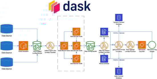 The computing architecture of the pipeline was deployed using Amazon Web Services cloud computing resources. A diagram showing an AWS version of the pipeline shown in Figure 1 is shown in Figure 3. Retrieval and storage of data follows a traditional extract, transform, and load (ETL) process [], for future applications in real-time edge cases. ETL pipelines extract data from source, transform the data into a usable structure for algorithms, and then load the data into the necessary storage mechanism. To simulate part of the use case of a neuromorphic chip placed on an edge device, the completed YOLO model was stored in a Docker container, which was subsequently placed within an Ubuntu EC2 T2 instance. As the EO data is extracted from the source, it streams through the YOLO Docker container and, if a ship is detected, the output is uploaded to an S3 data lake storage bucket. The uploading of this data then triggers an AWS Lambda function to instantiate a transient elastic map reduce (EMR) Dask cluster to pair the EO detection with existing AIS data. The ship-pairing output is stored as a parquet file in another S3 bucket, which itself triggers an additional legality filter AWS Lambda function upon successful upload to the bucket. Once the event passes through the Lambda function, it is stored in a master Ship DynamoDB database. Contextual and Static Data Lambda functions are then triggered for use in the neural network behavioral classification model.