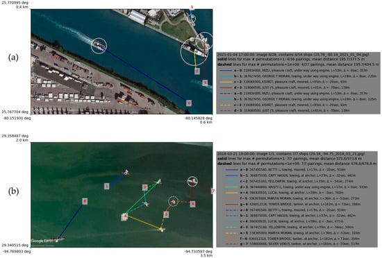 Examples of the ship−pairing algorithm, working against the Google Earth EO dataset and the Marine Cadastre AIS data. Each ship within the image is labeled with a letter, while each AIS message within the confines of the image is labeled by a number. Solid lines represent ship pairings when Pmax = 1 (Greedy Approach) and dashed lines represent ship pairings when Pmax = 108. (a) An example in which both the greedy and extensive approaches agree on the ship pairings within the image. All four ships within the image are paired to the same AIS messages by both techniques. (b) A more complex example, where discrepancies appear between the two pairing approaches. The cluster of ships on the right-hand side of the image causes the two approaches to attempt to pair AIS messages with different ships.