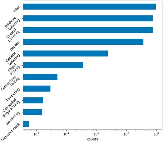 The final labels generated are shown in Figure 5. These labels are to be used as truth data for the behavioral classifiers to train against for accuracy evaluation. Many behaviors, such as the various forms of loitering, were quite common. Other behaviors, such as fishing behaviors, existed across a range of occurrence rates. The data used for training primarily encompasses the month of January 2022 and was taken from the Marine Cadastre database.