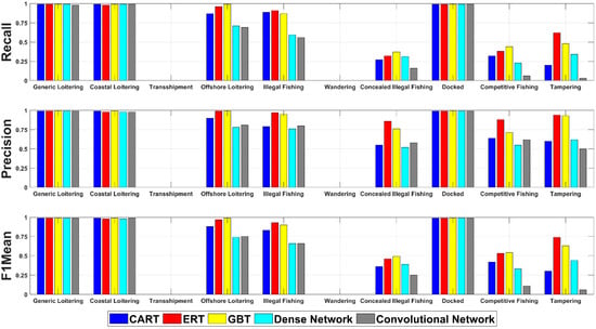 Lastly, during behavioral classification, the contextual data most likely plays a minor supplementary role in helping to identify specific ship behavior. Information such as weather data might help the algorithms isolate activity, such as the various forms of loitering or being docked, which could possibly increase in occurrence during times of inclement weather, when seas are rougher. Although this work did not specifically analyze how significant a role contextual data played in behavior classification success, future work aims to do so.