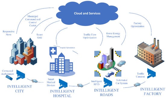 The term Internet of Things was proposed in 1999 by Kevin Ashton [4] at the Massachusetts Institute of Technology (MIT), where research was conducted in the field of Radio Frequency Identification networks (RFID) and sensor technologies. If all the objects in our environment were equipped with this technology, computers could observe, identify, and understand the world [5]. An IoT device is characterized by a small electronic system equipped with a processor, sensors to measure the environment, actuators that allow it to perform specific actions in response to the data received, and communication modules that use network protocols. Today, IoT encompasses these technologies that will enable everyday objects to communicate through the network to collect information that allows us to monitor the status and behavior of these objects. An example is in smart homes, in which sensors are installed in different areas of the house and connected to a central system, optimizing the use of electricity, water, and energy consumption. The central axis of IoT is the data collected by sensors and devices; this data is sent to remote servers or the cloud for processing; once the information that is considered important has been extracted from them, the IoT devices can receive it from the server or cloud a series of instructions to perform a certain action. In business terms, the value for organizations is in the information extracted from said data because it allows for automating processes, optimizing resources, and making better decisions, leading to greater operational efficiency [4,6]. Figure 1 shows application scenarios for IoT. IoT has notable effects in many areas of daily life (home automation, health and wellness, connected vehicles, etc.) and business and industrial sectors (logistics, automation, and control of production processes & security). The size and variety of data circulating on today’s networks are increasing exponentially, and IoT contributes significantly to this increase in volume. Cisco estimated that more than 30 billion devices would be connected to the network, implying an increase in the substantial amount of traffic circulating through the networks and reaching data centers in the cloud treatment [7].