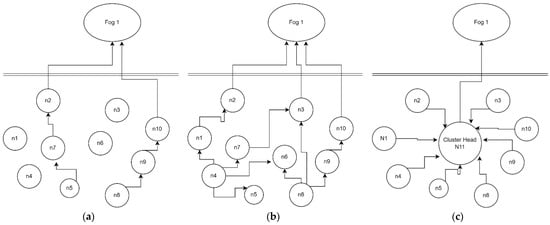 During our implementation, we come across three different scenarios. The first scenario, as shown in Figure 2a, is the scenario I, where data is less in the sense that the node is capable of processing and able to communicate the data without any resource constraints. As shown in Figure 2a, node5 and node8 have sensed the data and can process the data, hence forwarding the data to node7 and node9, respectively. Fog 1, the edge node, receives the sensed data from its nearest nodes, i.e., node2 and node10.