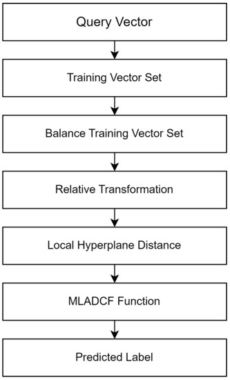 where is the new training set F″. The second step of HRCKNN calculates the distances for all the classes, i.e., k local hyperplane. The relative transformation is also adopted to construct the relative space in Equation (19). In the final step, the HRCKNN calculated the distance of k local hyperplane. A local hyperplane is constructed as follows