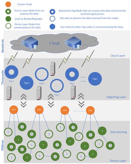 The MLADCF has three layers, i.e., Device layer, Edge-Fog layer, and Cloud layer. The device layer is placed at the bottom of the MLADCF. The Edge-Fog layer is in the middle, and finally, the Cloud layer is placed at the top of the MLADCF. The IoT environment is squeezed in the above 3-level framework, as shown in Figure 4. The device layer at the bottom of the MLADCF is the densest layer among the three layers. Usually, millions of active nodes present are sensing data from the environment.