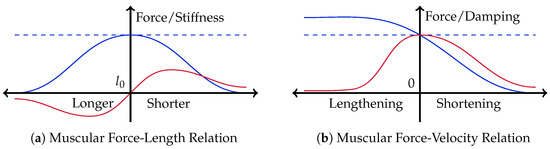 These insights support the assumption that the (short-range) end-point stiffness is generated on a muscular level, exploiting the physically inherent dynamics of the contractile elements, tendons, and mounting positions of the muscles. Recent studies on the effects of having muscle-like dynamics built inside actuators support this hypothesis. The pure existence of muscle-like force characteristics significantly reduces the amount of control information required from some central intelligence [44]. The general types and shapes of these characteristics are well known and create a muscle-level, zero-delay feedback system, the so-called preflexes [45,46]. There are three main dependencies: time, length, and motion. While the temporal force dependency (i.e., muscular fatigue) can be ignored as an unnecessary limitation, the two others construct the two impedance properties, i.e., stiffness and damping, respectively. In general, the emitted force of a muscle with respect to these two separated impedance properties can be estimated as follows: