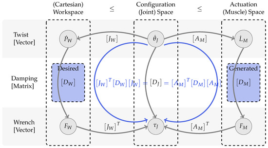 Kinematic coupling of the (Cartesian) workspace, the configuration (joint) space, and the actuation (muscle) space of an arbitrary, robotic limb. The two matrices, and , represent the position Jacobian and the actuator gear matrices, respectively. All three matrices in the middle represent the appropriately dimensioned, symmetric, positive semidefinite damping matrices. In blue, the desired and generated damping representations are highlighted.