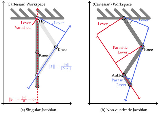 The first case of no solution is the well-known problem of singular positions. Whenever the Jacobian matrix becomes singular, solving Equation (7) results in no and/or infinite solutions. Figure 5a visualizes the problem of singularity at the example of the hip joint actuator of a planar, two-link robot without TCP orientation. As worked out in detail by Nejadfard et al. in 2018 [52], the direction of work of a hip-propelling actuator is parallel to the shank segment of the robot. In Figure 5a, these directions of work are pictured by the blue and the dashed arrows, and the red bidirectional force arrows represent the two sketched robot configurations. This alignment results from the requirement that these forces have to exactly pass through all joints that should not be affected by the hip, i.e., all others. The distance between these vectors and the hip joint embodies the effective lever arm coupling the joint torque and the force in the workspace. As highlighted in the sketch, this lever arm vanishes in the singular position, leading to a theoretically infinite resulting force vector in the workspace. Hence, in a singular position, the effective direction of actuation in the workspace is undefined and cannot be used for further processing.