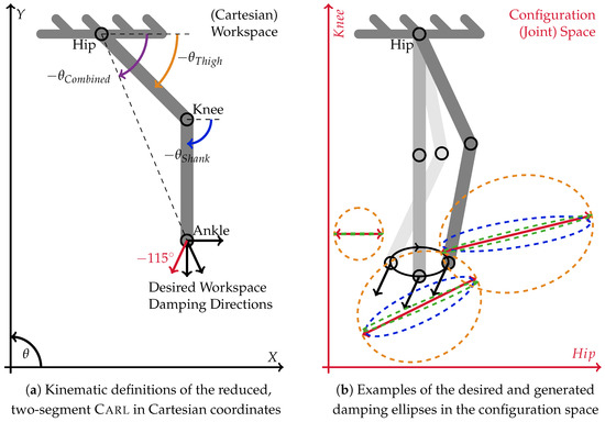 Three sets of theoretical experiments were executed to evaluate the capabilities and limits of the herein-introduced new control philosophy. The ankle of one leg of the planar, bipedal robot Carl, reduced to its two leg segments, thigh and shank, was moved in an ellipsoidal trajectory. Both segments have identical, natural lengths of 42 cm. The hip and knee joints are limited in their range of motion from each 0° to −120° and −90°, respectively. Detailed descriptions of the construction of Carl can be found in [29,36]. During the ellipsoidal motions, the introduced distribution strategy is applied to approximate four individual, one-dimensional unit-damping vectors in the workspace. The four directions are 0°, −65°, −90°, and −115°. They are visualized as arrows attached to the robot’s TCP in Figure 6a. The damping matrix in the workspace is the outer product of the damping vectors with themselves. Equation (3) is used to translate the workspace damping matrix into the configuration space damping matrix that is required by the damping distribution algorithm.