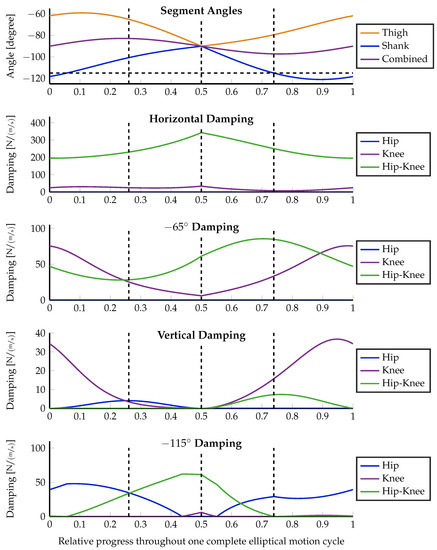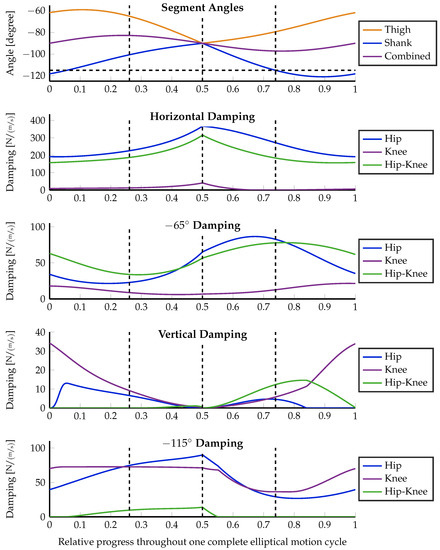 From the technical description of Carl in [29], the moment arm ratio of the biarticular hip–knee actuator can be estimated notably below 1 throughout the whole elliptical motion. The detailed analysis of this ratio by Nejadfard et al. [52] gives insight that the direction of work of a biarticular actuator at the hip–knee position with such a small lever arm ratio is quite close to the knee’s one. Consequently, when looking through the result plots in Figure 7 and Figure 8 using the original lever arms of Carl, the knee actuator is mostly unused. Except for the special case of the vertical desired damping, the biarticular hip–knee actuator takes over all responsibilities of the knee. A second exception is the desired damping at with damping-weighted optimization (see Figure 8). In this case, it is just the other way around. The monoarticular knee is recruited, while the biarticular hip–knee actuator is more or less unused. However, this can be treated as a side effect of the massively deformed generated damping ellipse due to the zero-weighting, as described above.