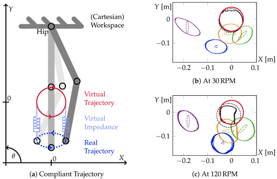 Sketch and experimental results of the so-called compliant trajectory control applied to the ankle of the planar, compliant robotic leg Carl as first presented in [1]. On the left, figure (a) visualizes the working principle of the compliant trajectory control. In red, the commanded circular reference trajectory is shown. The virtual spring–damper element and a potential real resulting ankle trajectory are sketched in blue underneath. On the right-hand side, Figures (b,c) plot the captured, real ankle trajectories of Carl in workspace coordinates at different virtual impedances at speeds of 30 RPM and 120 RPM respectively. Centered at the origin, the shared circular trajectory is given in red. The two-dimensional damping matrices of each of the five individual experimental runs per speed are plotted as dashed ellipses of the same color as the appropriate resulting ankle trajectories. The five damping matrices are: , , , , and .